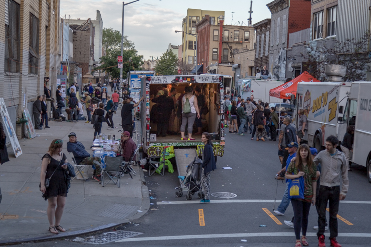 Bushwick Open Studios, which took place this past weekend seems to be getting bigger every year. This year, the block parties, band line-ups, food trucks, street sellers and other entrepreneurs hoping to cash in on the event’s draw, threatened to take some of the focus off the art. On Saturday afternoon and into the evening, it was a bit of a mad-scene in the area around the Morgan L stop, with crowds of people on the sidewalks, and performers, food trucks and mobile galleries set up on a closed portion of Grattan Street. However, we had come there for the art. Below are some of the highlights from the first day: